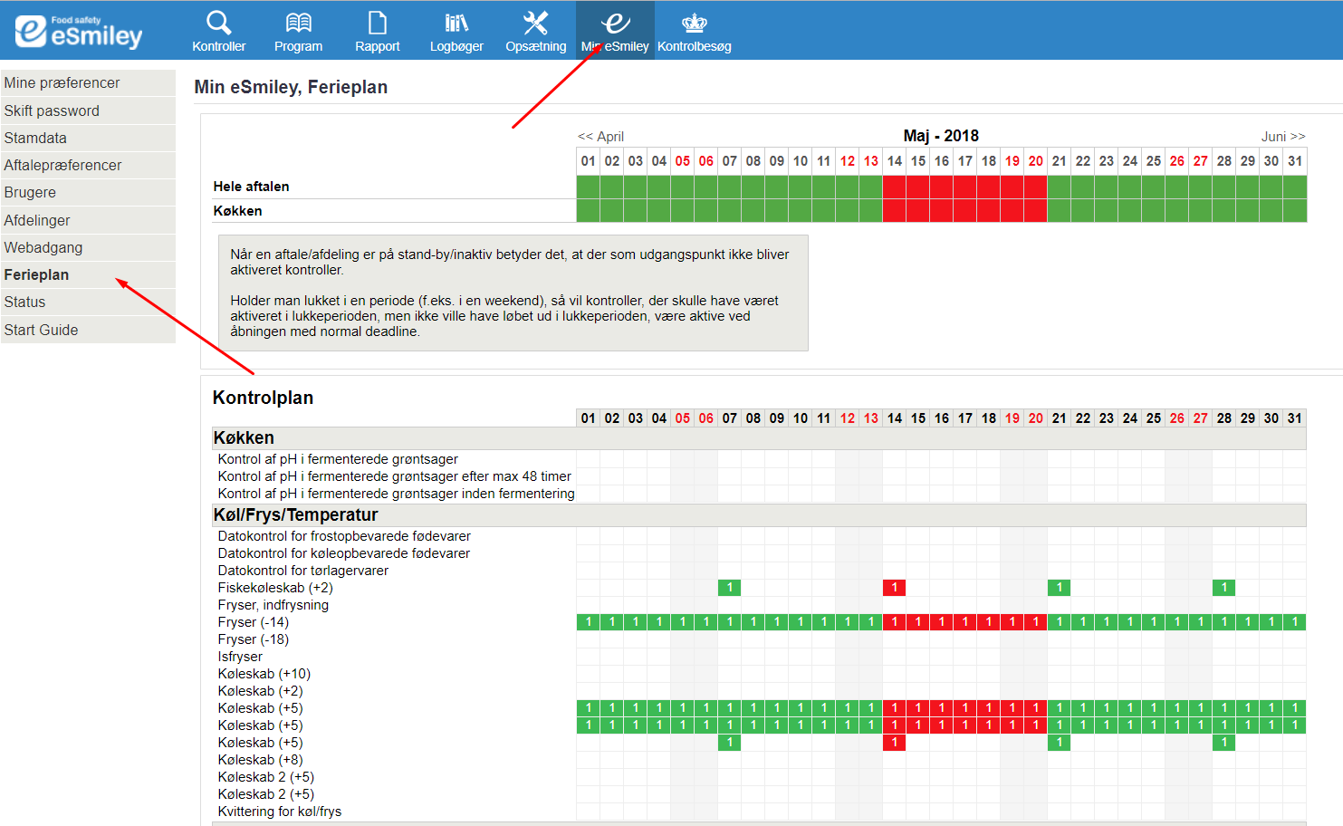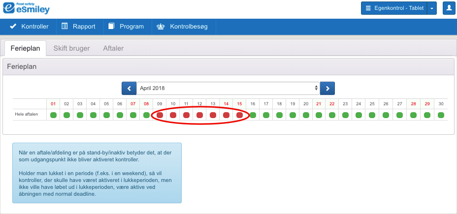 - Kontroller, der bliver aktive i ferieperioden og løber ud efter du er startet igen efter ferien, vil dukke op på dit system i samme sekund, som ferien er overstået. Derfor er det vigtigt, at du logger på eSmiley den første dag efter du er kommet tilbage fra ferie, da du potentielt kan have kortere tid til at udføre en kontrol end normalt.